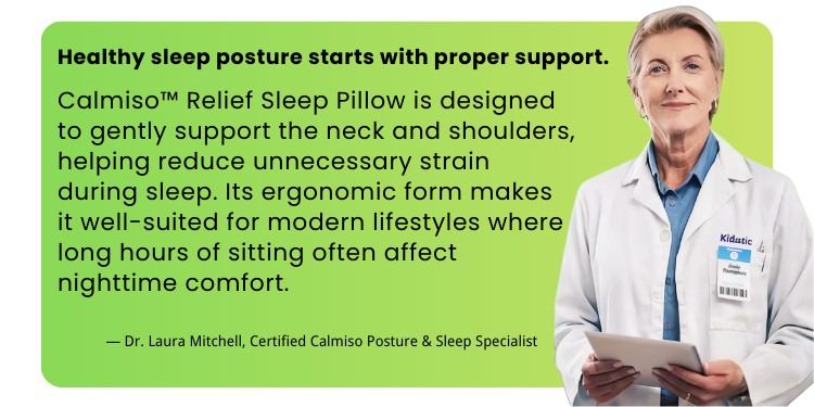 Calmiso™ Relief Sleep Pillow is an ergonomic sleep support pillow designed for people who experience neck and shoulder discomfort from long workdays, screen time, or poor sleep posture.
